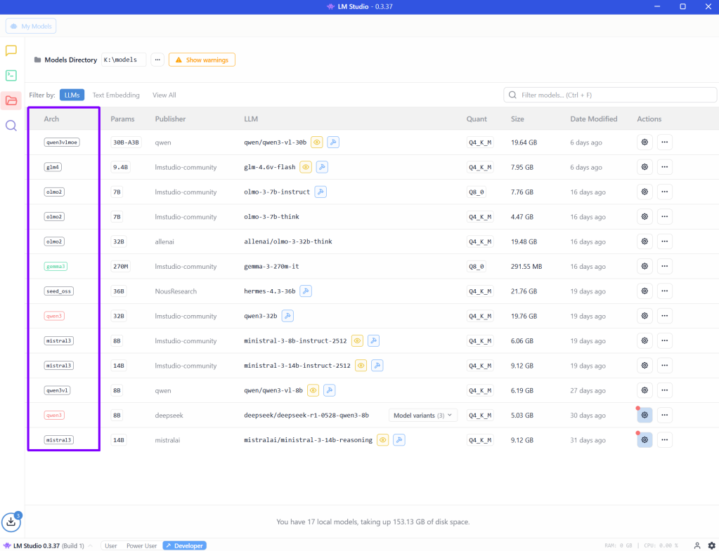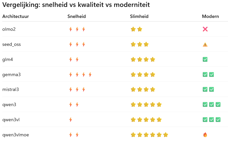 Als je in LM studio een aantal modellen hebt gedownload zie je hun (transformer) architectuur, de wijze waarom deze modellen functioneren, voorbeeld:
