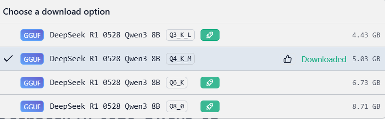 Je keuze (Q4_K_M) is meestal de beste balans tussen snelheid en kwaliteit voor DeepSeek/Qwen modellen. Perfecte keuze.