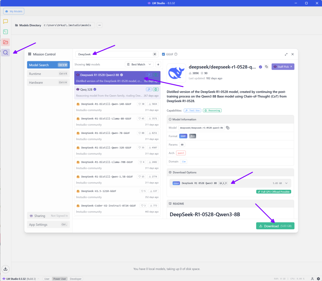 In ons voorbeeld downloaden we de LLM: DeepSeek R1-0528 Qwen 3 8B [Q4_K_M], grootte ca. 5GB