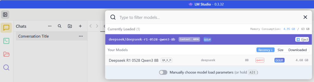 Nadat de LLM is gedownload kan je hem direct inladen, en via het chatvenster kan je uit beschikbare (gedownloade) LLM’s kiezen:
