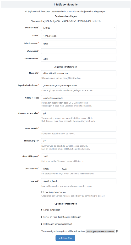 Ga nu naar http://website.nl:3000, daar zie je nu de gitea installer: