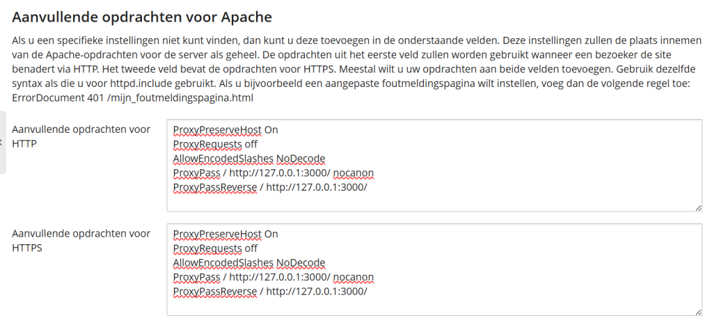 Vul hier extra configuratiegegevens in bij “Aanvullende opdrachten voor Apache” en vuil onderstaande in voor HTTP en bij HTTPS: