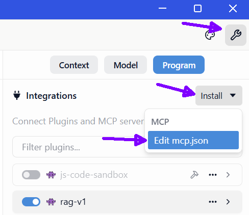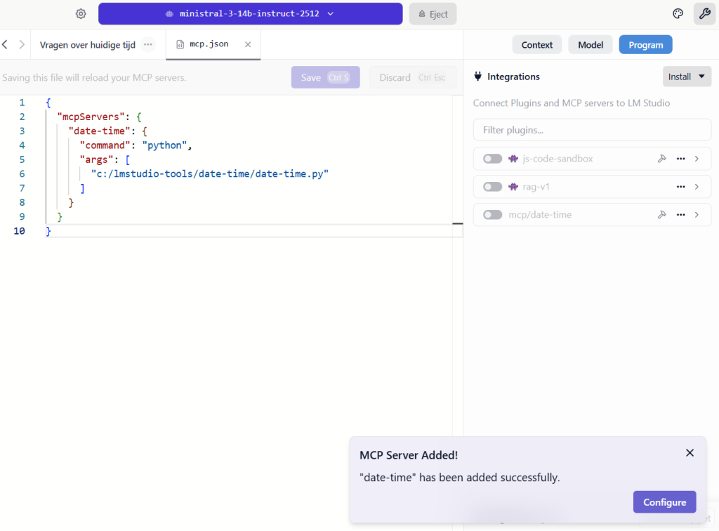 LM Studio ondersteunt tegenwoordig “plugins” via MCP (Model Context Protocol). Dat werkt met een mcp.json configuratiebestand waarin je tools, servers of integraties definieert.
