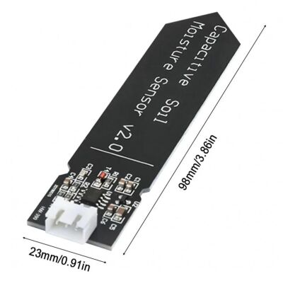 The Capacitive Soil Moisture Sensor Module V2.0 measures soil moisture reliably using capacitive sensing technology. Unlike resistive probes that corrode over time, this capacitive sensor provides longer life, stable readings, and a water-resistant PCB coating for use in both indoor and outdoor plant care projects. It outputs an analog voltage that corresponds to soil moisture level and operates at 3.3V to 5V for broad compatibility with popular development boards.