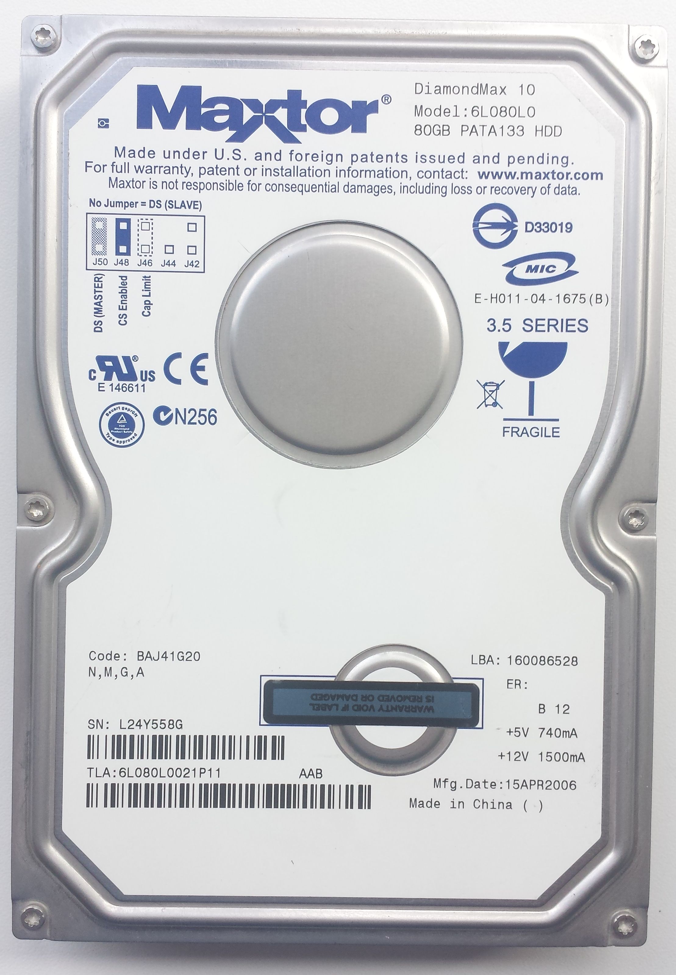 HDD PATA/133 3.5″ 80GB / Maxtor DiamondMax 10 (6L080L0)