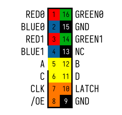 Deze panelen hebben 12 digitale pinnen nodig (6 bit data, 6 bit control) en een goede 5V voeding 3A aanbevolen