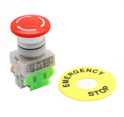Een noodstop schakelaar met drukknop om te resetten, reset doormidden van een kwartslag draaien, geschikt om stoom/spanning in nood af te schakelen, heeft een NO en NC contact.